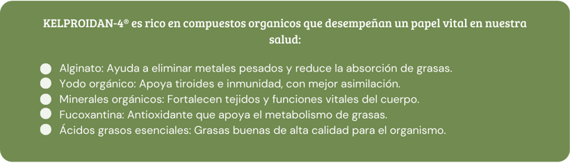 Formulado con una mezcla de algas marinas pardas, contiene un alto aporte de minerales, fibras solubles y