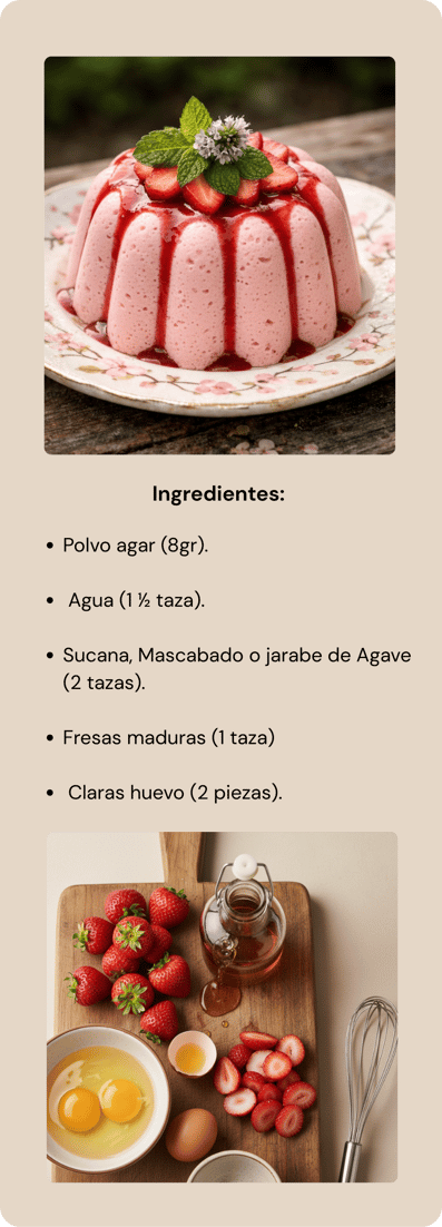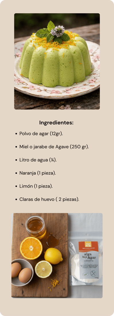 Postre suave y ligero, elaborado con alga agar, de textura firme y sabor delicado a almendra, ideal para disfrutar bien frío.